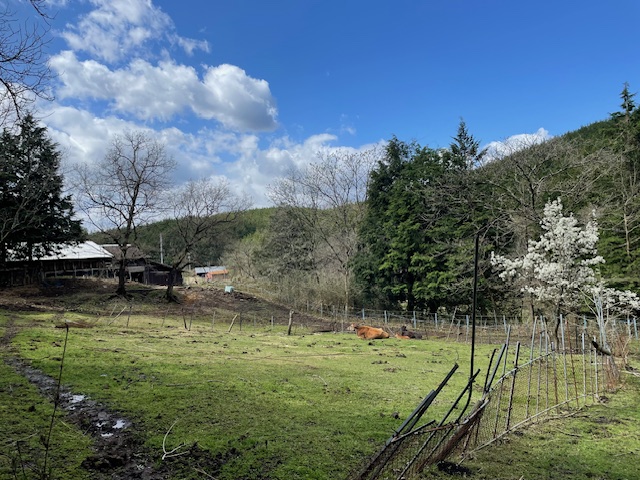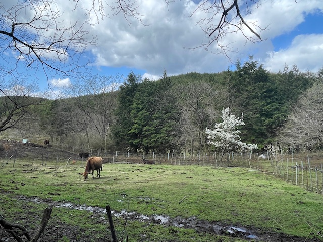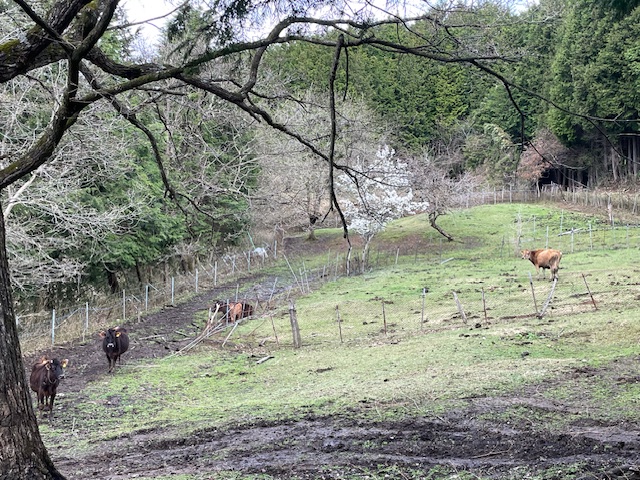 広い放牧地は3月に生まれた子牛をいれて5頭。やっと草が生え始めたところですが、桜が咲き、ゆったりと草を食むジャージー牛たちの気持ちよさそうなこと!