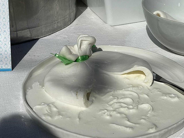 中庭に案内されるや、すぐにブッラータの製造が始まりました。チーズ職人のおじさんはカードを持ち上げて、楽しそうに丸めていきます。そして糸状に裂いた生地と生クリームを入れて袋を閉じて出来上がり。出来立ては熱々なので、試食用はちゃんと冷やしてあるものを出してくださいました。
