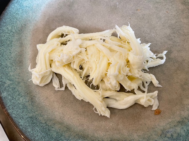 お餅のようにちぎって広げ、中にちぎったカードとクリームを混ぜて入れて。ブッラータとは呼ばないけど、作り方は同じ