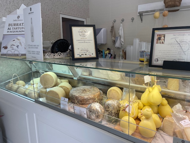 南イタリアは、チーズを販売するお店が通りに面してあり、奥に製造所があるので、店先には出来立てが並べられていました。かつて日本のお豆腐屋さんもそうでしたね。