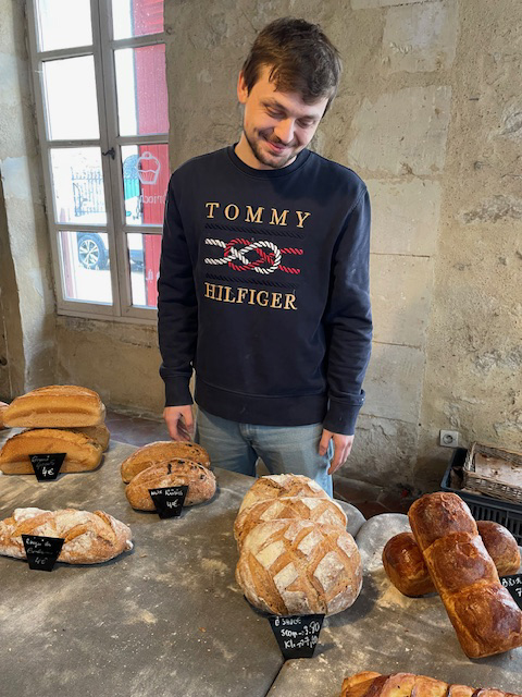 橋を渡って小高い旧市街地を歩くと、下に川が見えます。その向こう岸に見えるのがファビアンのショップ。品性のいい街並みが素敵です。町の中ではパン屋さんも開店。週2回、焼いたパンを30キロ離れたこの町まで売りに来ているそうです。