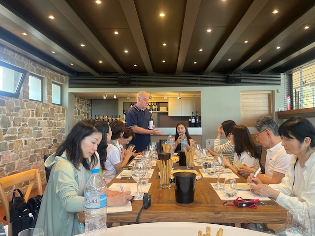 ランチのあとはワイナリーの訪問です。ぶどう畑を見学するには暑すぎるので、すぐに試飲タイムとなりました。私たちを案内くださったのは、4代目のニコス氏。