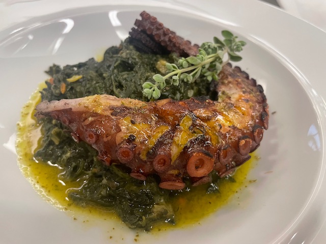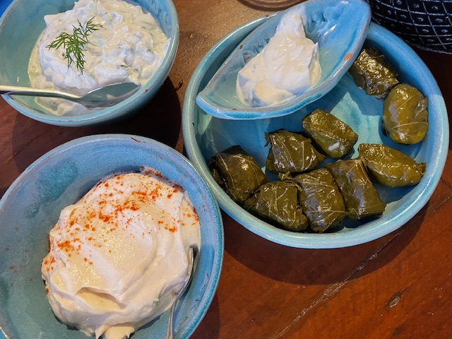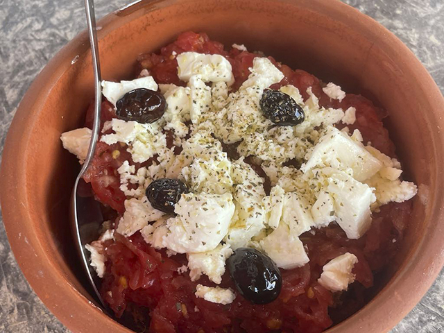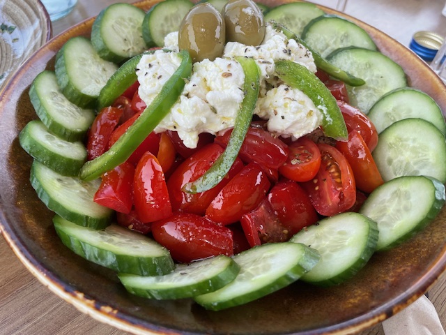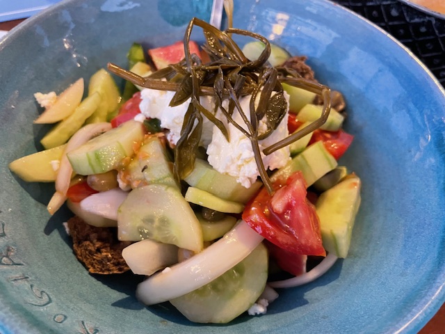船内のレストランで伝統のグリークサラダ、タコのグリル、ムサカを楽しみました。