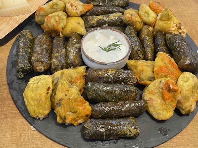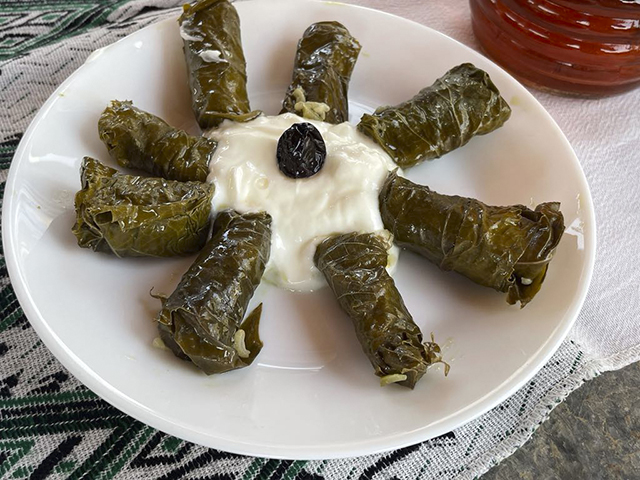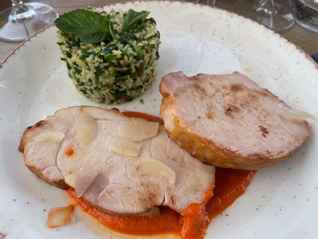 製造見学後はキッチンで伝統のチーズ料理を教えていただき、いよいよ楽しみなランチタイムとなりました。澄み切った青空と心地いい空間。チーズと野菜たっぷり前菜の後のメインは仔羊の炭火焼。肉に直接火があたらないように焼かれていた肉は私たちのためだったのです。
