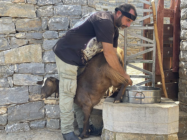 山羊の頭を足で挟んで搾乳。私たちも代わる代わる体験させていただきました