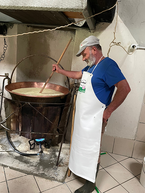 チーズ製造は早朝から始まっているはずですが、私たちの到着に合わせたかのように、銅鍋の乳がちょうど凝固してカードのカットが始まるところでした。ひげを生やしたおじいさんがカードを丁寧に均一にカットして攪拌したあと再び火にかけてゆっくり温度を上げて静置。