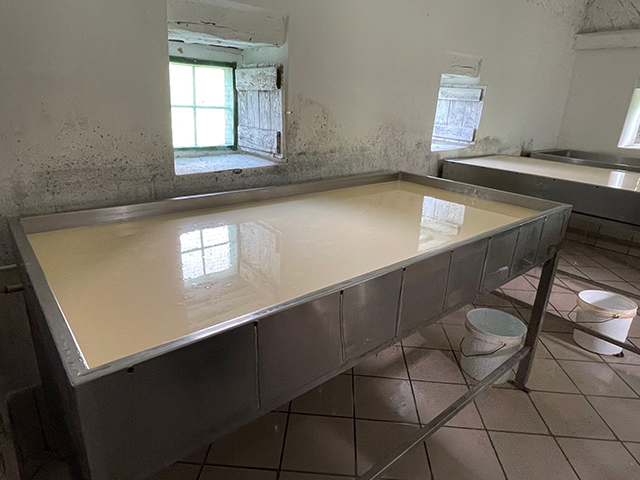 待っている間に外で深呼吸!搾乳した乳をバットに静置してある部屋は水が流れて厳かな雰囲気!