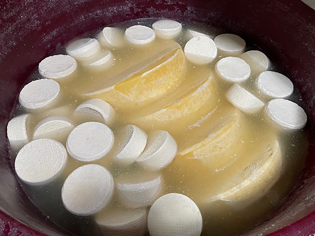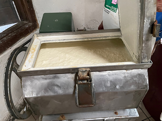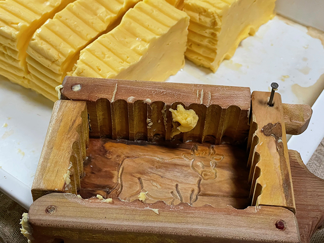 鍋の底にカードが沈んだ頃合いをみて、布でカードを集めて型入れです。銅鍋ひとつからたったふたつ。型に入れた後の重しは、なんと前日製造したシルテル!なんと合理的なのでしょう。製造が終わったころを見計らって、バター製造と続きます。バターの色の濃さと滑らかさは格別です。