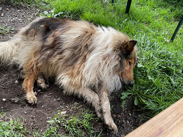 ②ノルマンディ牛は頭とお腹は白く、目の周りがパンダのように黒か茶色。疲れてぐったり!