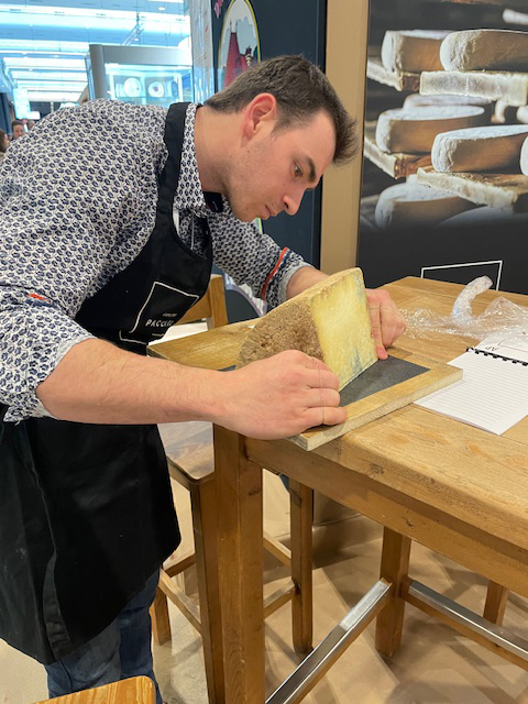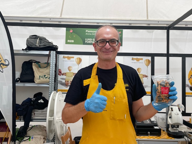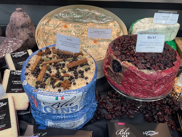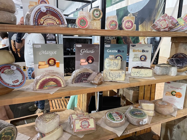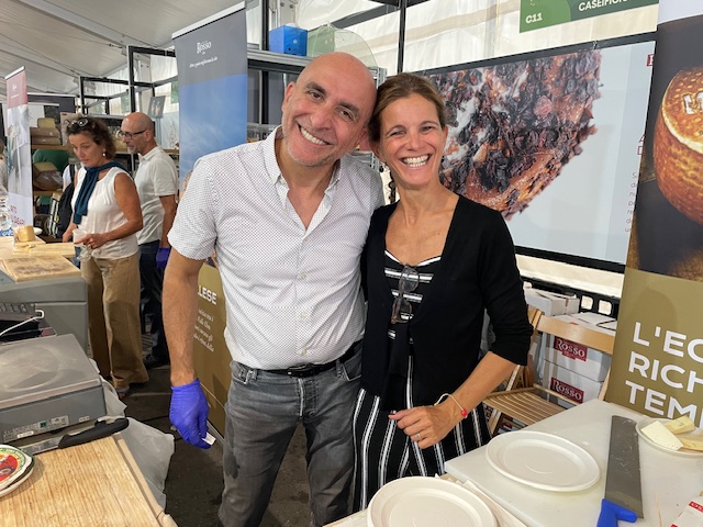 さて、会場では地元イタリアのチーズメーカー、ロッソ社のエンリコとマリア夫妻と会えました。彼らはアルピニストとしても活躍するたくましい夫婦です。つくるチーズは、伝統のマッカ-ニョはもちろんですが、「グラティン・ブルー」がほんとうにおいしい。しっかりと試食させていただきました。