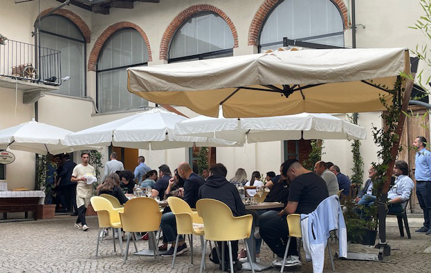 オッチェッリさんはBRA CHEESEの期間中、中庭付きの一軒家を借りて世界中のVIPを招待しています。挨拶だけしたいと思って顔を出すや、営業担当のアンドレアはすぐに席を用意してくれました。オッチェッリさんはちょうど取材対応中! それでも歓待してくださったことに胸が熱くなりました。