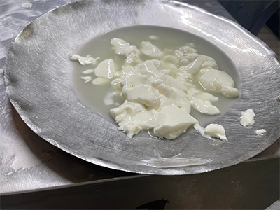 凝固したカードをスパンナローラ(大きな銅のお椀)で大きめのカードにカットしたあと10分ほど休ませてから