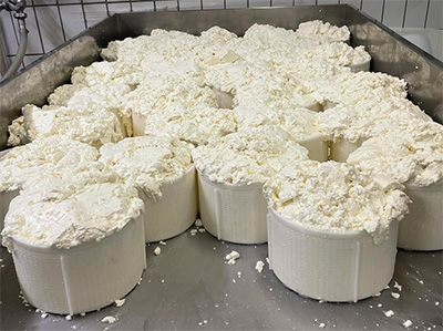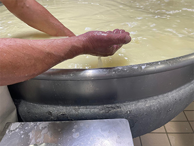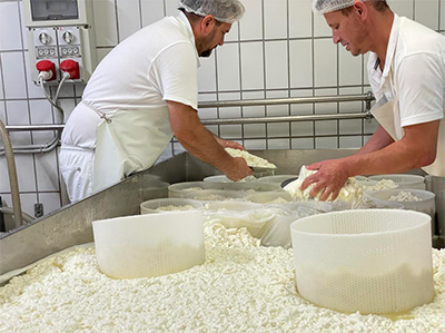 工房ではカードのカッティングをしているところでした。カットを終えて攪拌をしてヘーゼルナッツの大きさになったら、となりのバットに入れてホエーをあらかた抜いたところで、いよいよ型詰め作業です。