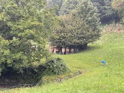 小雨が降りだしました。牛たちは雨やどり。
