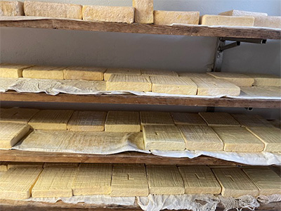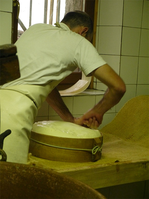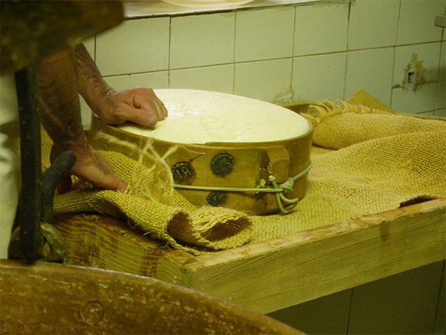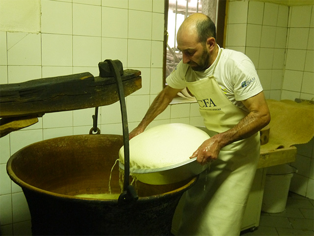 DOPの規定の最低熟成期間は12ヵ月! おいしいのは1年半から2年ものだといいます。チーズの乾燥を防ぐために熟成中に表皮をヤスリで削り亜麻仁油を塗ってツヤを出していきます。このとき、マウロさんのような生産者はたった7軒と聞きました。それでもいつかは共同の熟成庫をつくりたいと話していたことを思い出します。