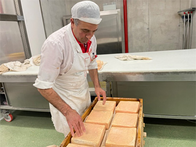 カザリゴーニのタレッジョの外皮はオレンジ色。しっとりと濡れて、中は柔らかくむっちり。塩味が控えめで、ほどよい酸味があり余韻が長く多くのファンがいます。おいしさの秘密は徹底的に磨き作業にこだわり、手間暇をかけているからだと思います。