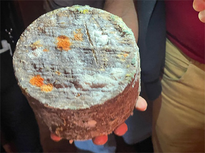 工房ができてからちょうど30年。この日、私たちを迎えてくださったのはアルトゥーロさんです。以前の訪問時から比べてショップは広くなり、カフェが併設されていました。 濃厚なヨーグルトとカフェをいただいたあとはゴルゴンゾーラの原型と言われるストラッキトゥン(Strachitunt)の見学です。ゴルゴンゾーラはもともとストラッキーノ・ディ・ゴルゴンゾーラという名前だということは知られています。現社長のアルバーロの努力のおかげで2014年にDOPに指定されました。無骨でカビが均等にはいっておらず、イタリアでも知らない人が多いのは仕方ないかもしれません。