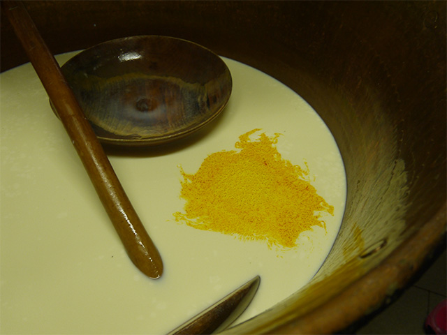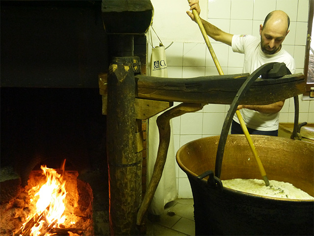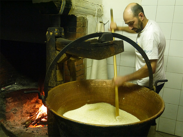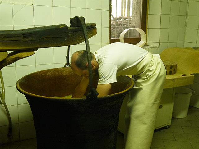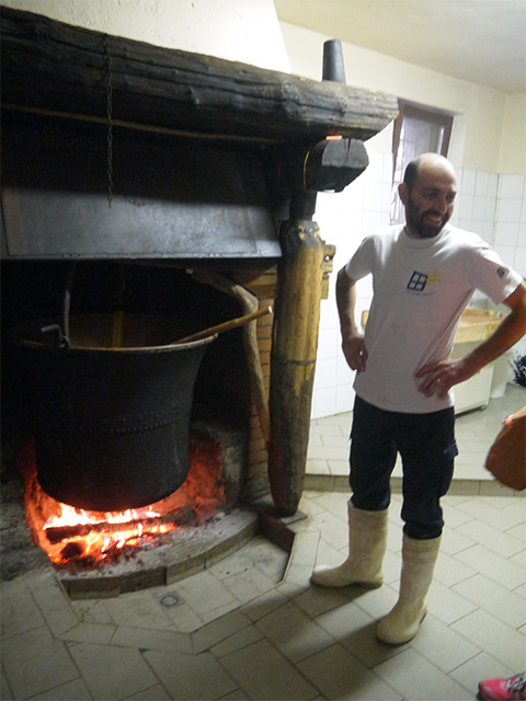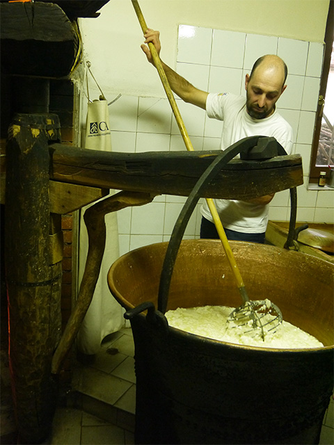 火にかけられた銅鍋は私たちの到着を待っていてくれました。銅鍋の前に立つのはマウロさん。ちょうど良い温度に達したら、火から離してサフランと凝乳酵素を加え、「ロテラ」と呼ぶヘーゼルナッツの棒でかき回して静置。この棒がスターターの役目、つまり乳酸発酵を促していると知り、驚いてしまいました。サフランはヴェネツィアに支配されていた頃は高級品とされ、チーズに入れることで高収入を得られたのだといいます。