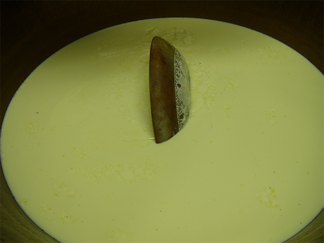 いよいよ、鍋の底にカードを集めて、丁寧にひとつにまとめて引き出して型にいれる作業です。銅鍋はまだ熱いと思いますが、慎重にカードを集めてホエーを抜きながら平たい桶にいれたあと、すぐに木製の枠に入れます。