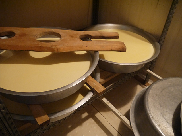 搾乳した乳を静置しておきます。上に浮いたクリームでバターを製造