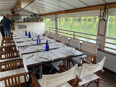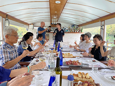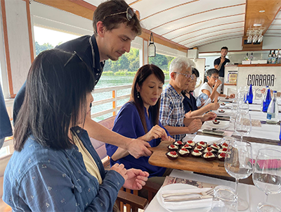 この日のサプライズは、ロレンツォが用意してくれた船上のランチタイム。ここでもチーズを数種類試食したはずなのに、美しい景色に癒されてすっかり夢心地。気がつくとメモもない状態でした!